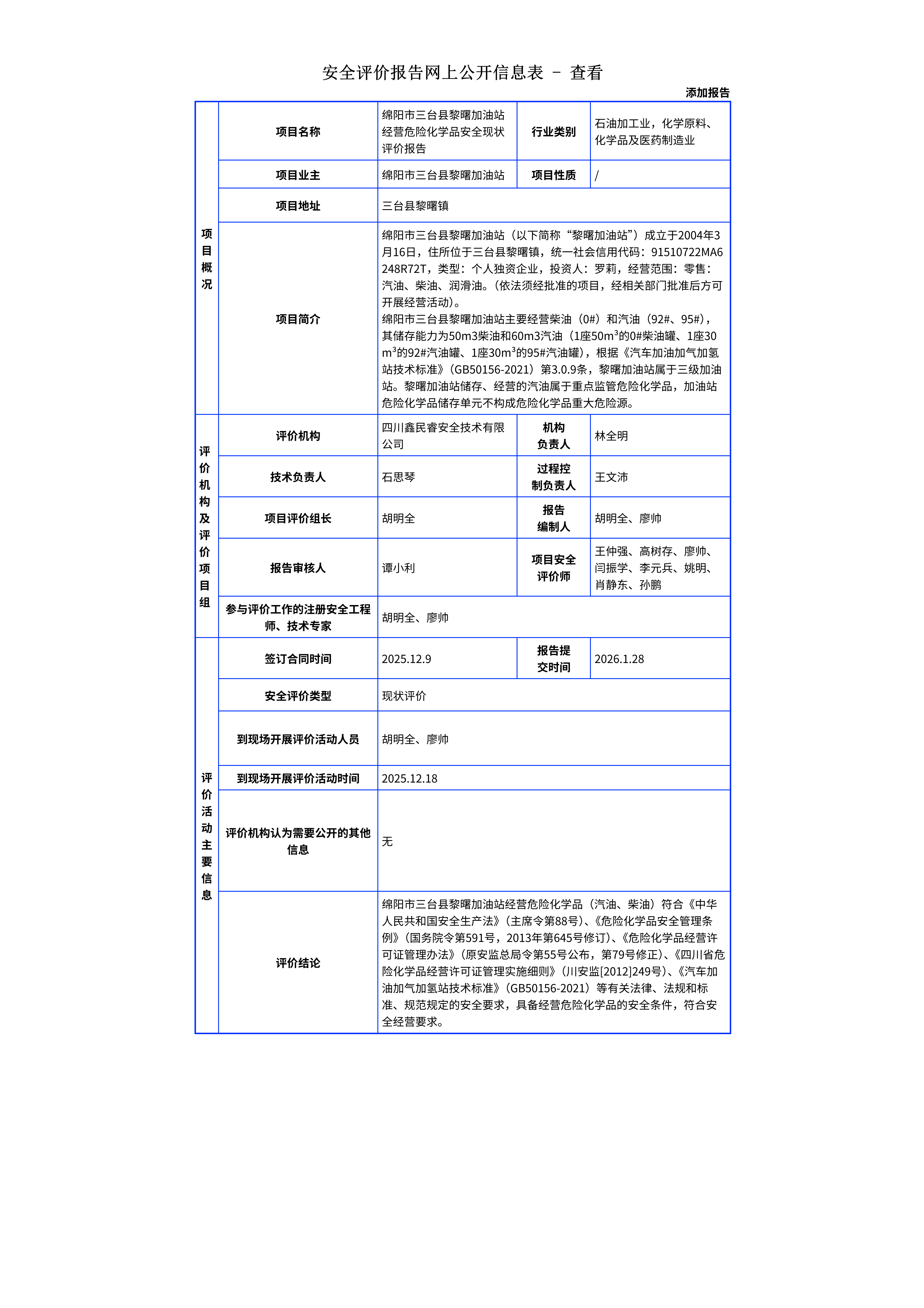 347绵阳市三台县黎曙加油站经营危险化学品安全现状评价报告