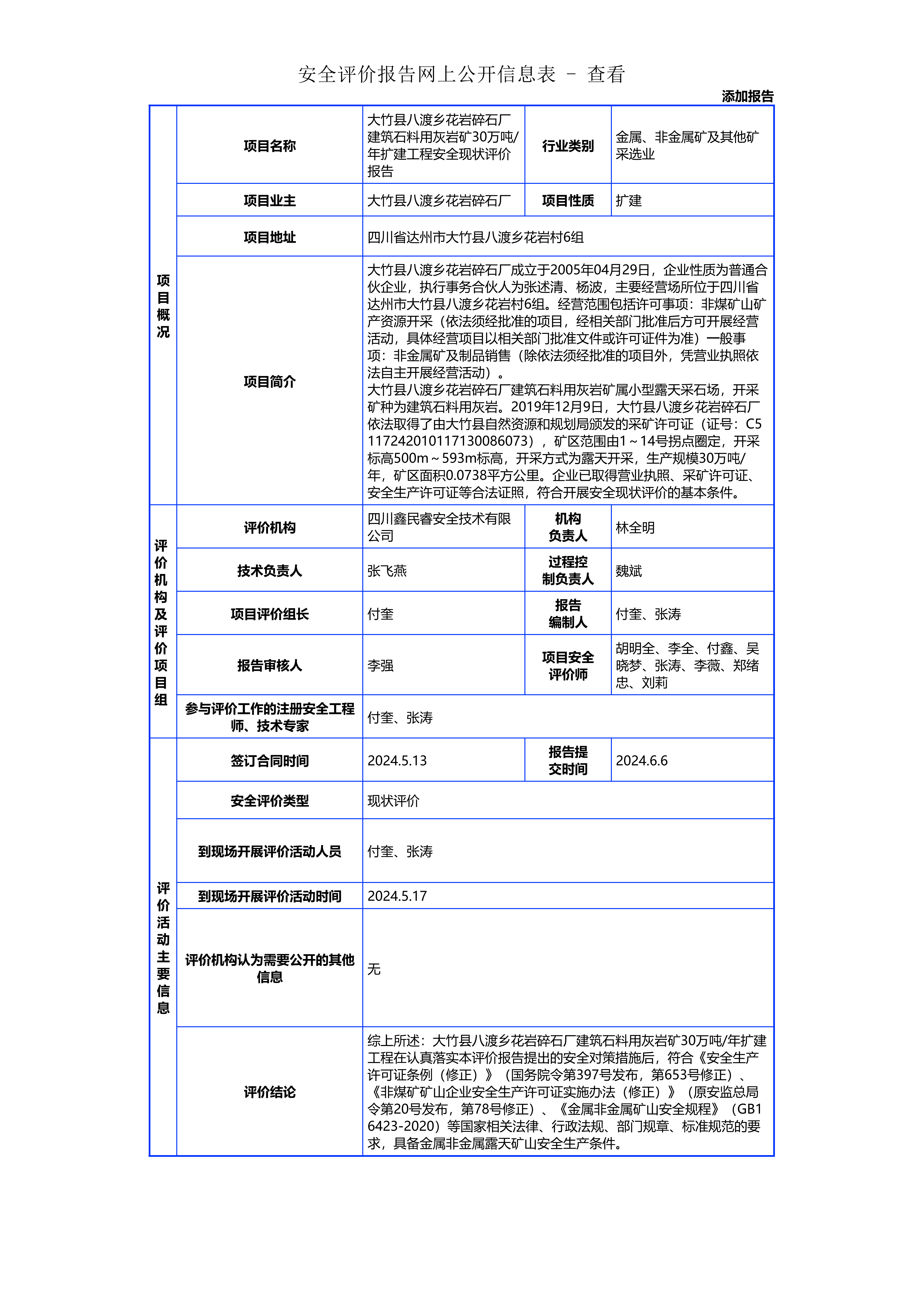 068大竹县八渡乡花岩碎石厂建筑石料用灰岩矿30万吨年扩建工程安全现状评价报告
