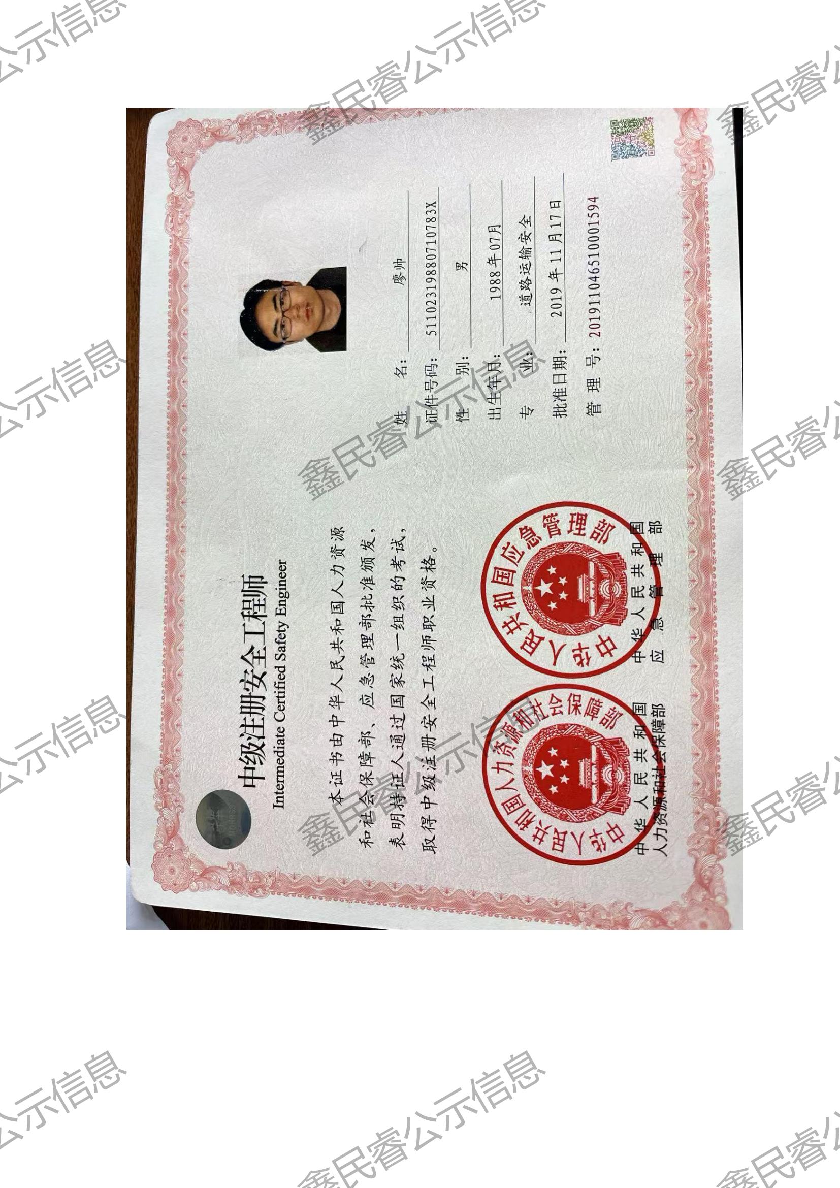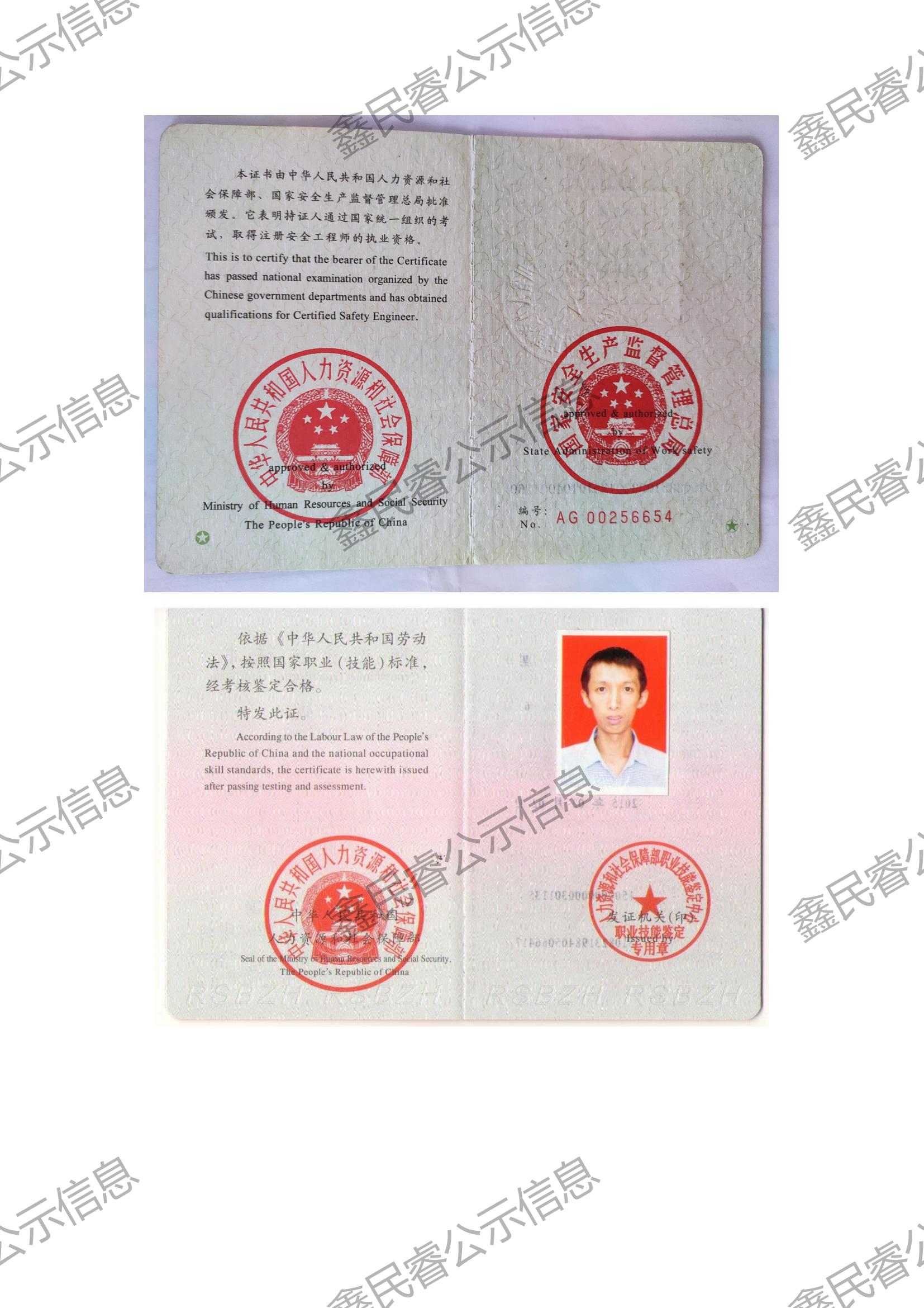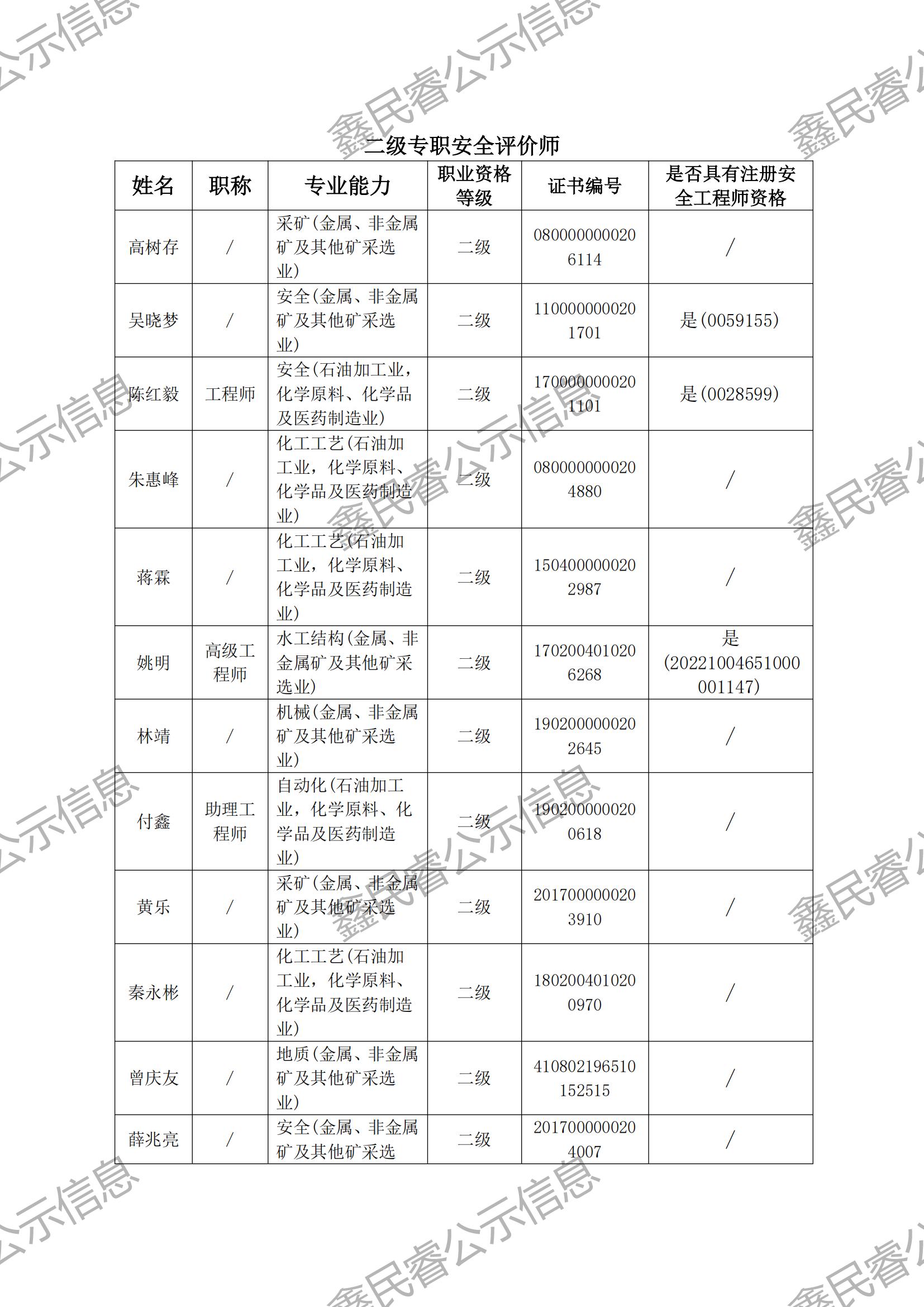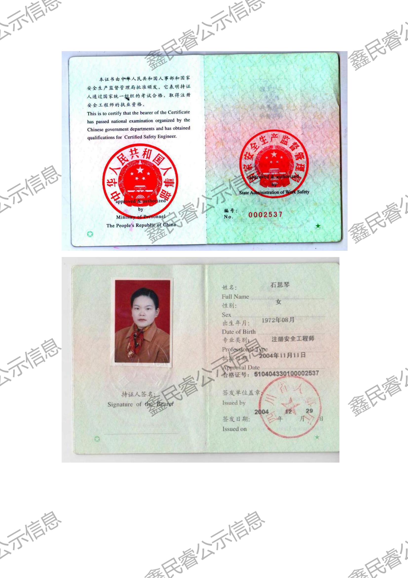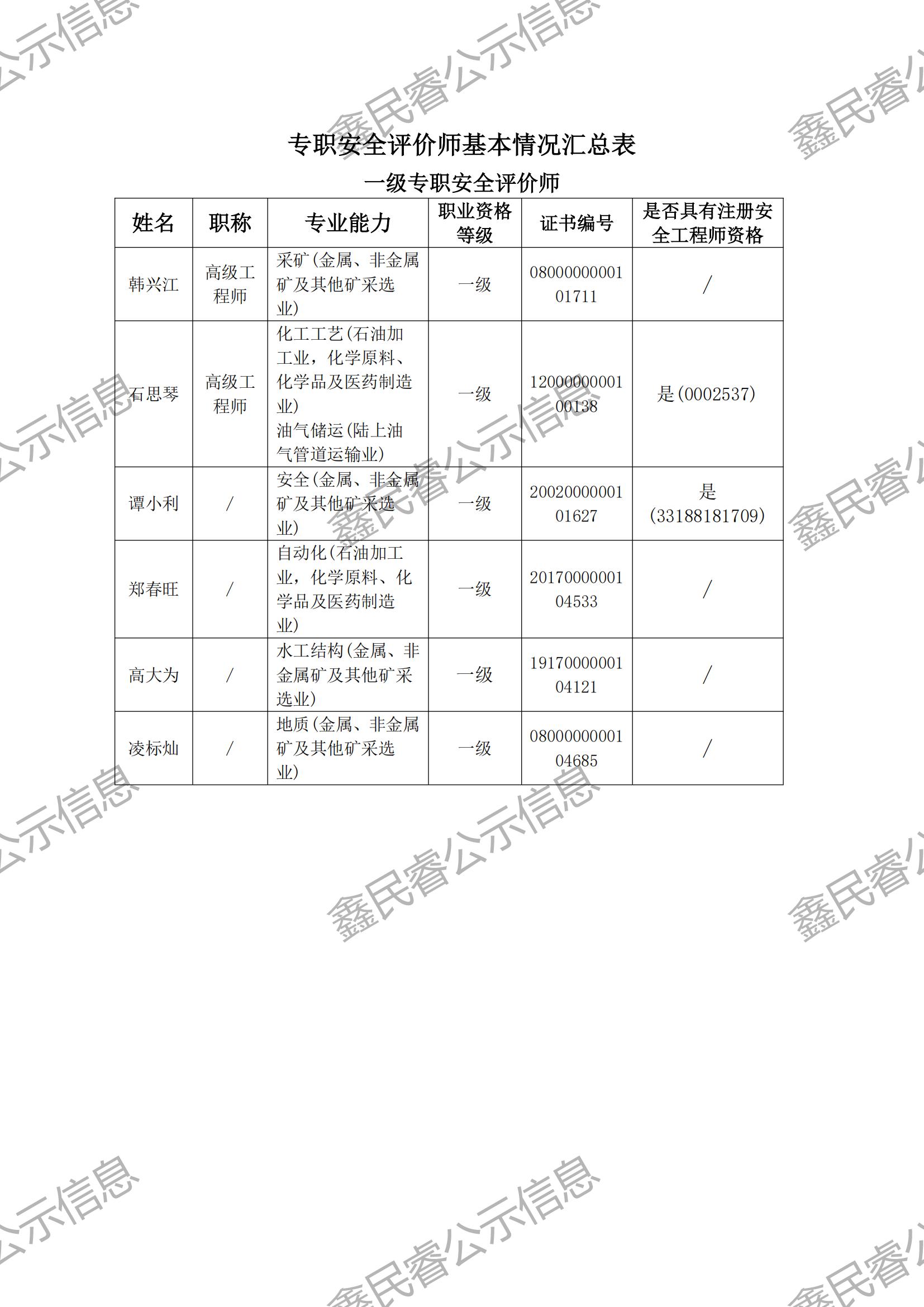 我公司鑫民睿专职安全评价师、注册安全工程师信息公示: