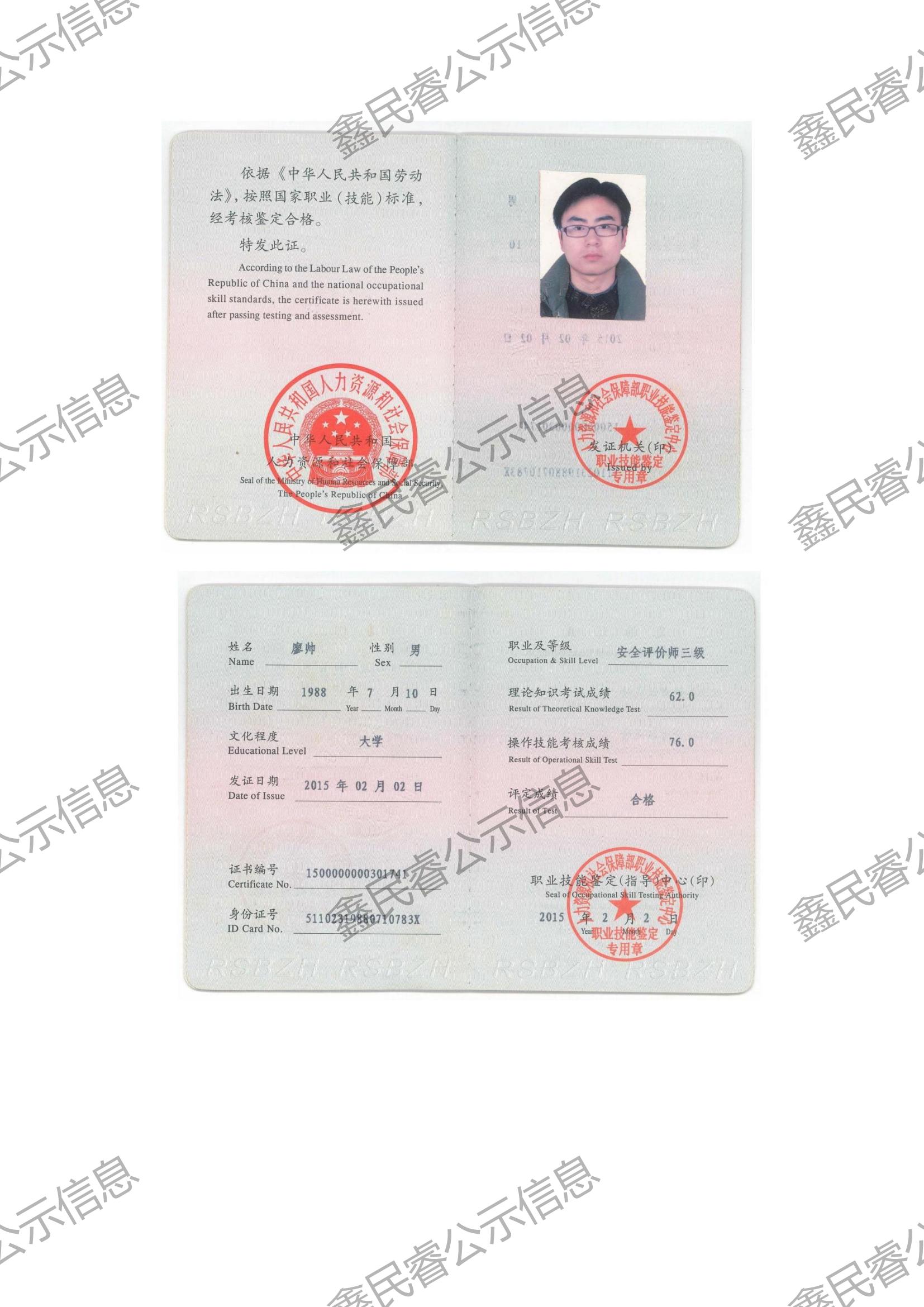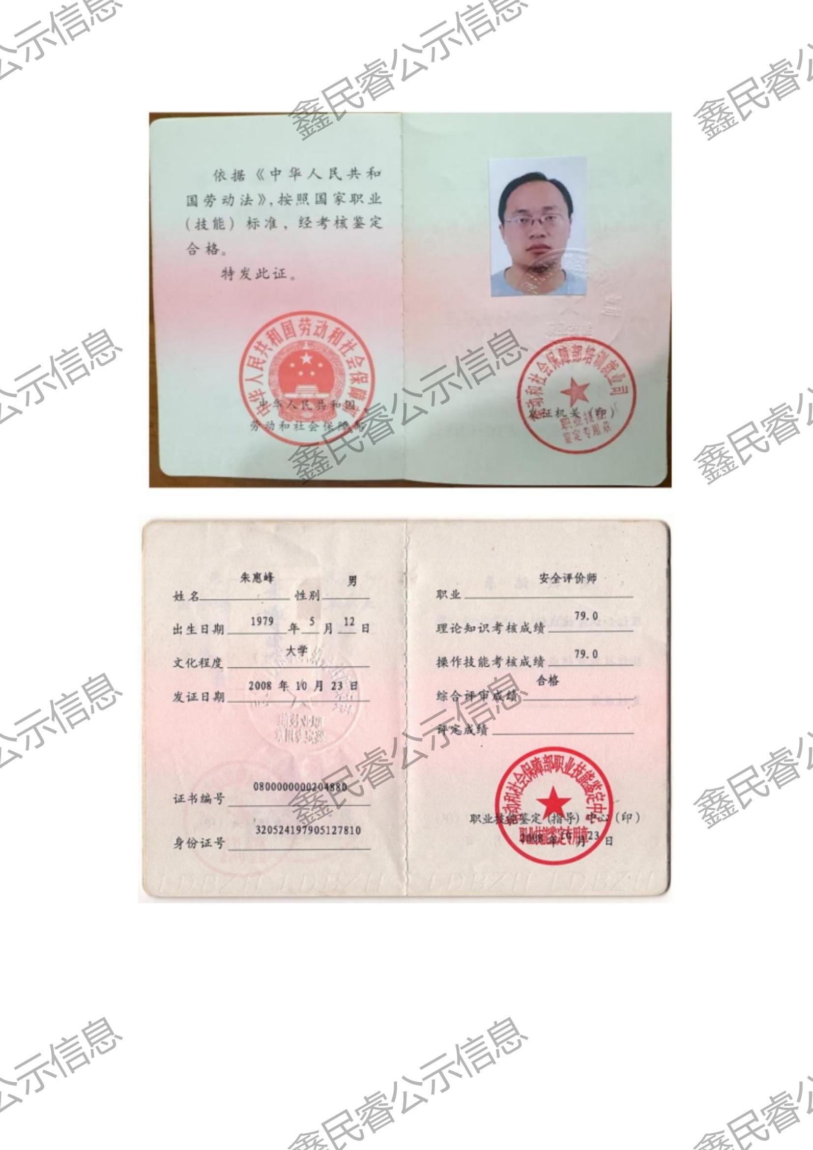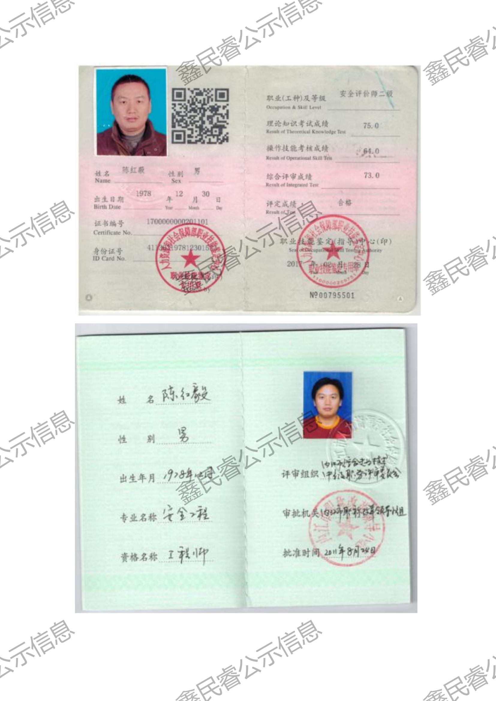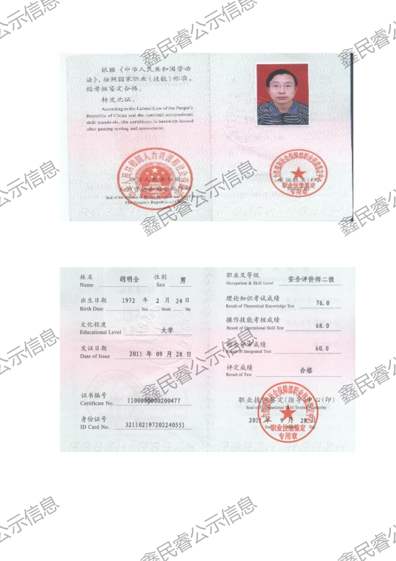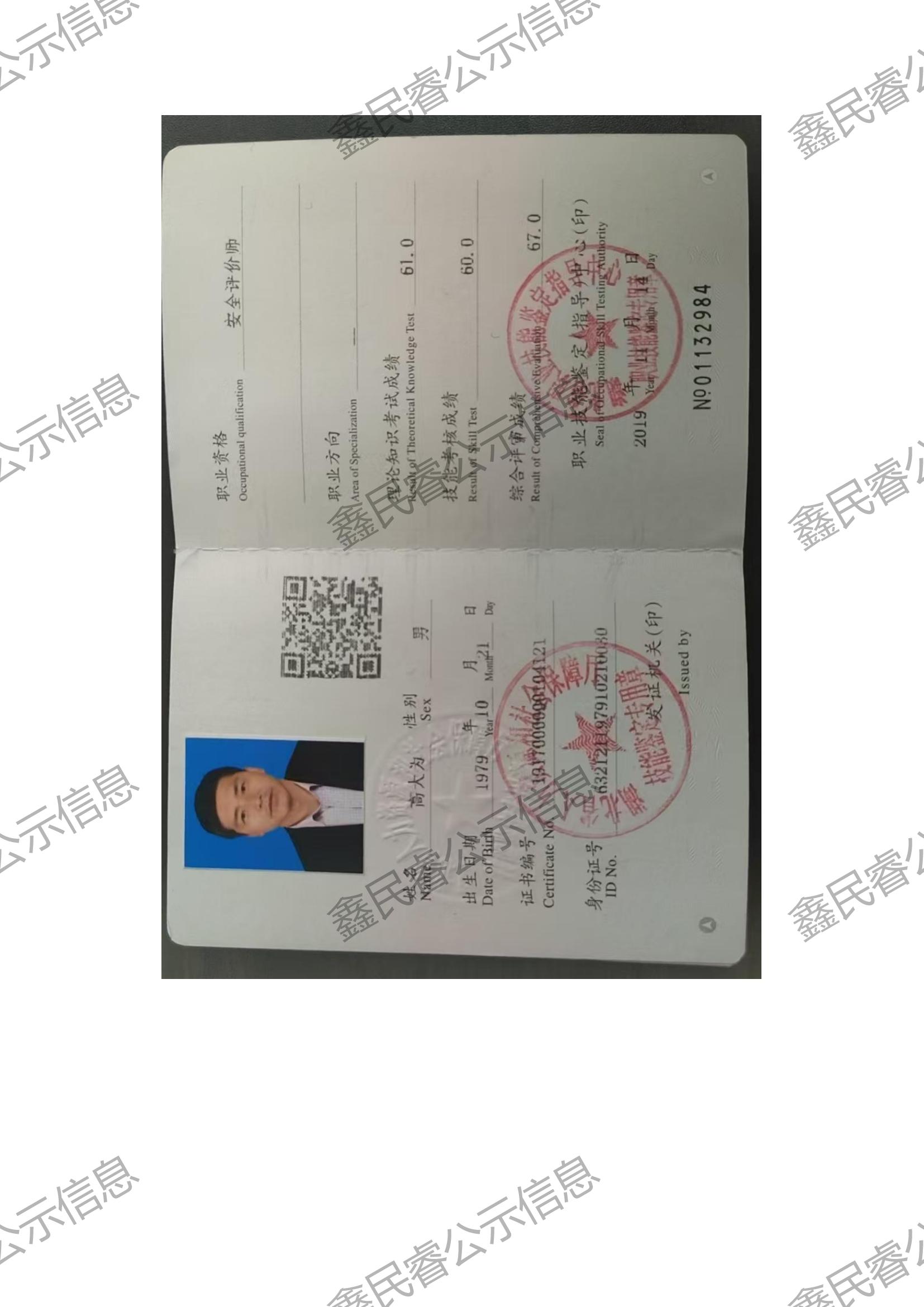 我公司鑫民睿专职安全评价师、注册安全工程师信息公示: