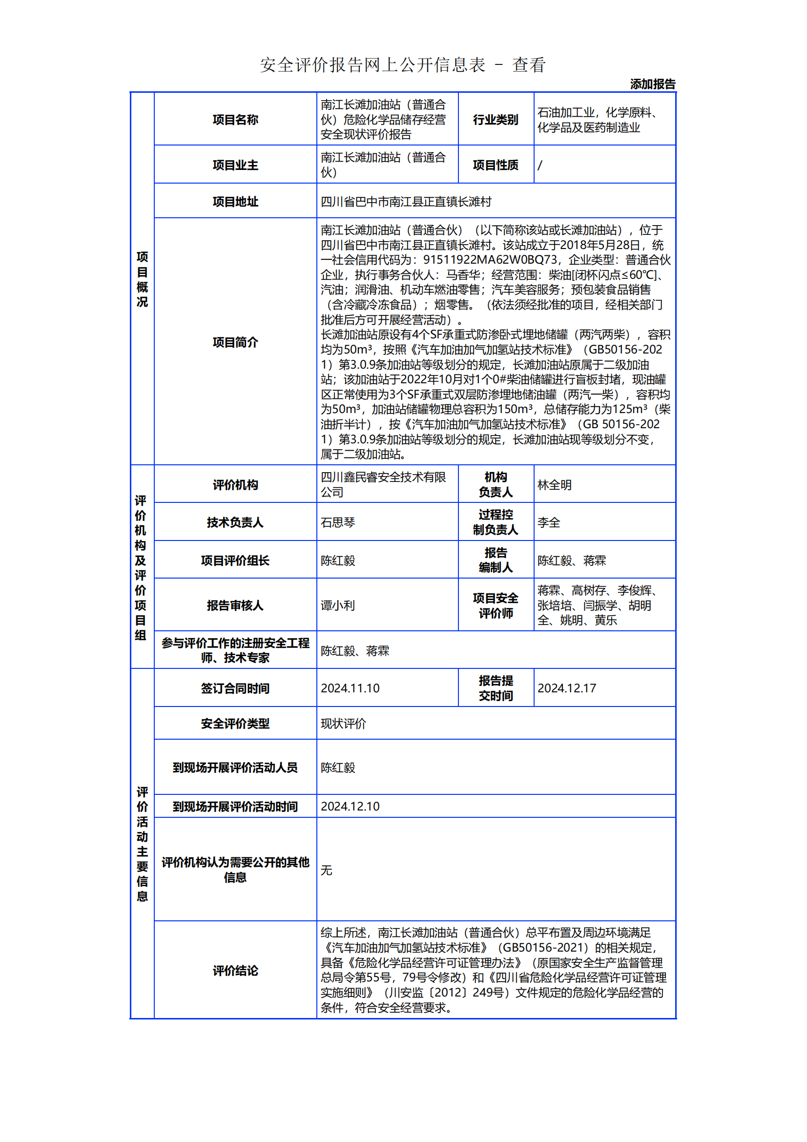 133南江长滩加油站(普通合伙)危险化学品经营安全现状评价