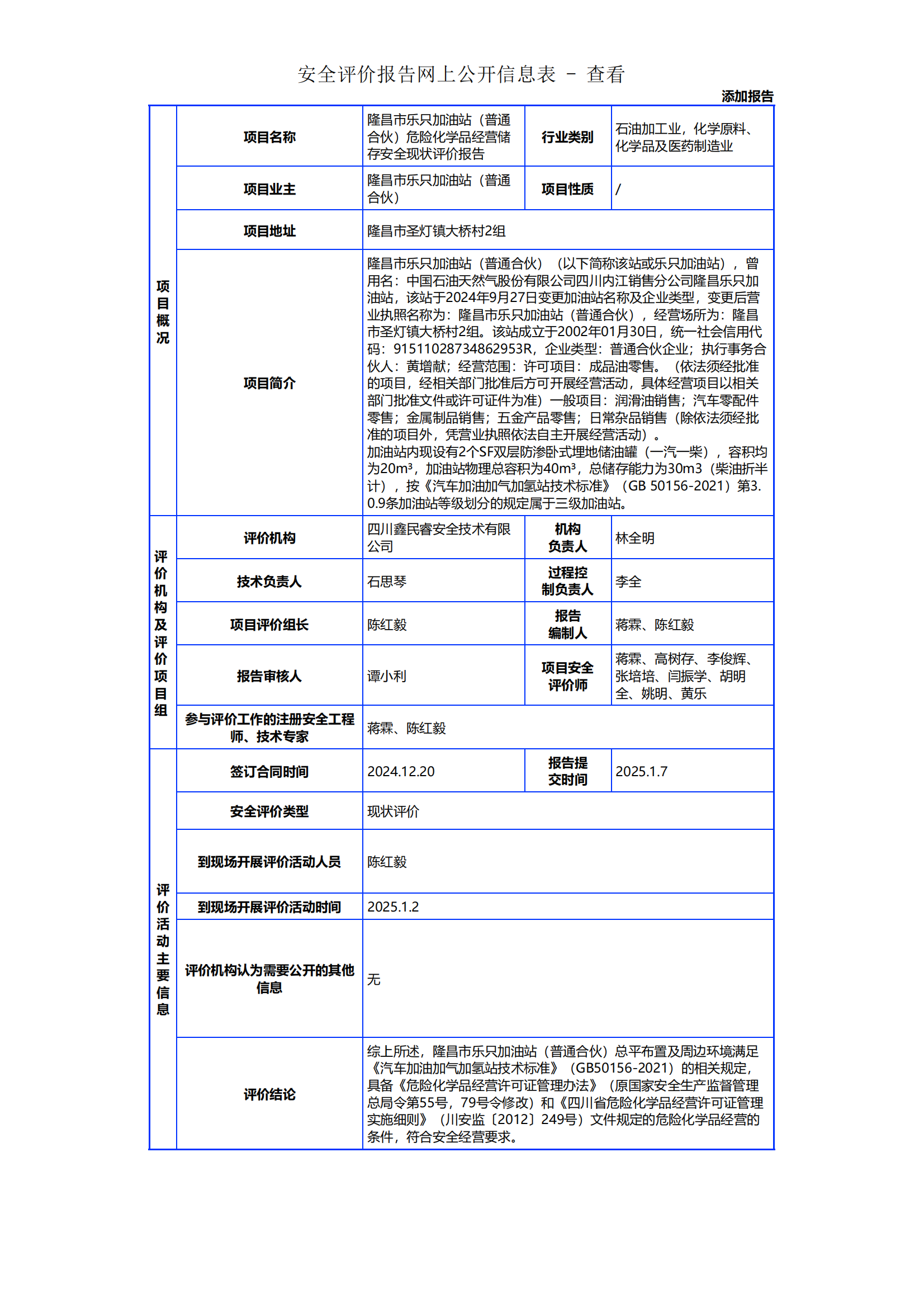 135隆昌市乐只加油站(普通合伙)危险化学品经营储存安全现状评价