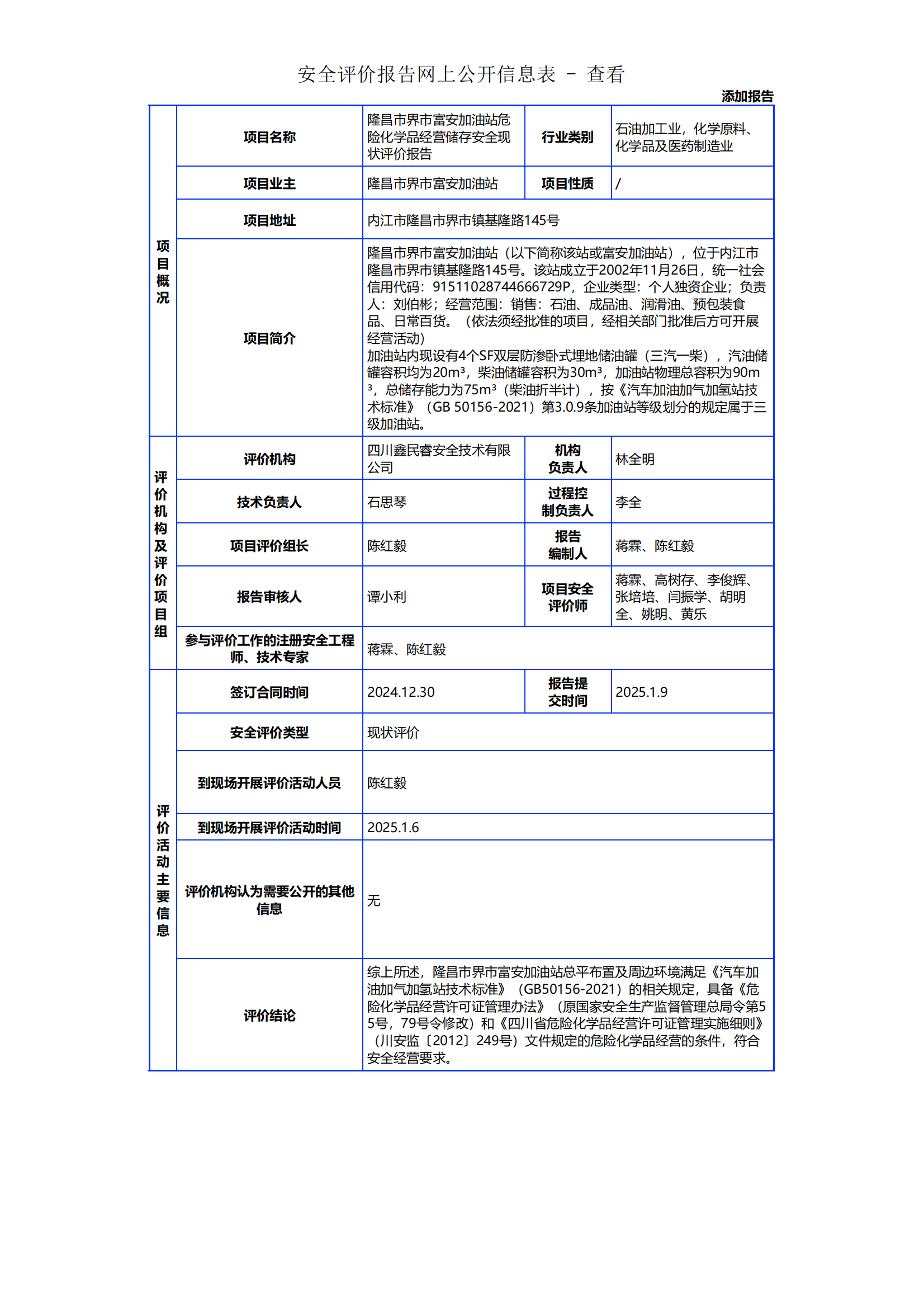 137隆昌市界市富安加油站危险化学品经营储存安全现状评价