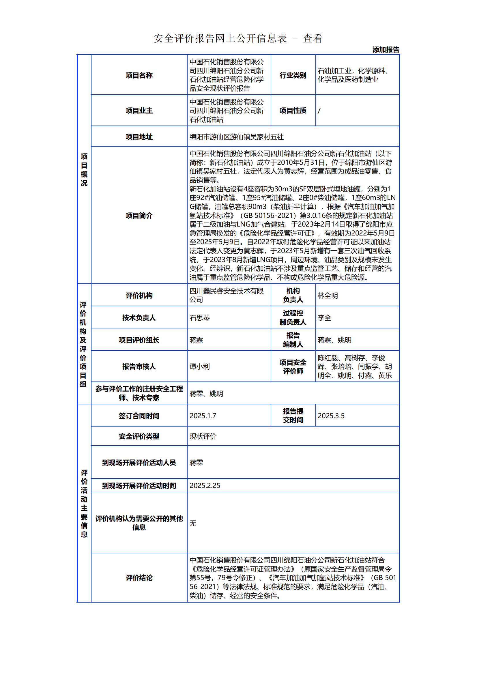 159中国石化销售股份有限公司四川绵阳石油分公司新石化加油站经营危险化学品安全现状评价报告
