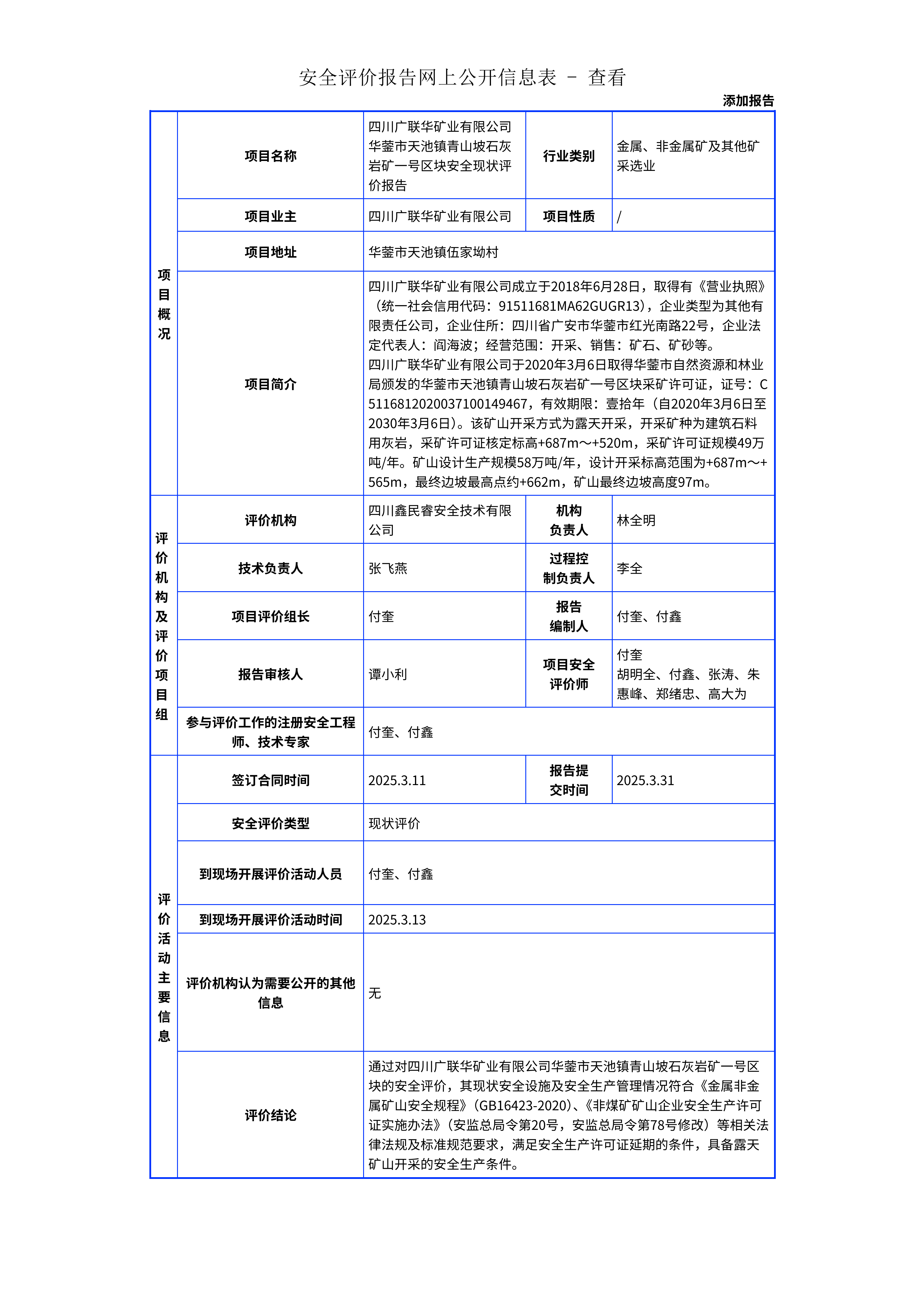 175四川广联华矿业有限公司华蓥市天池镇青山坡石灰岩矿一号区块安全现状评价报告