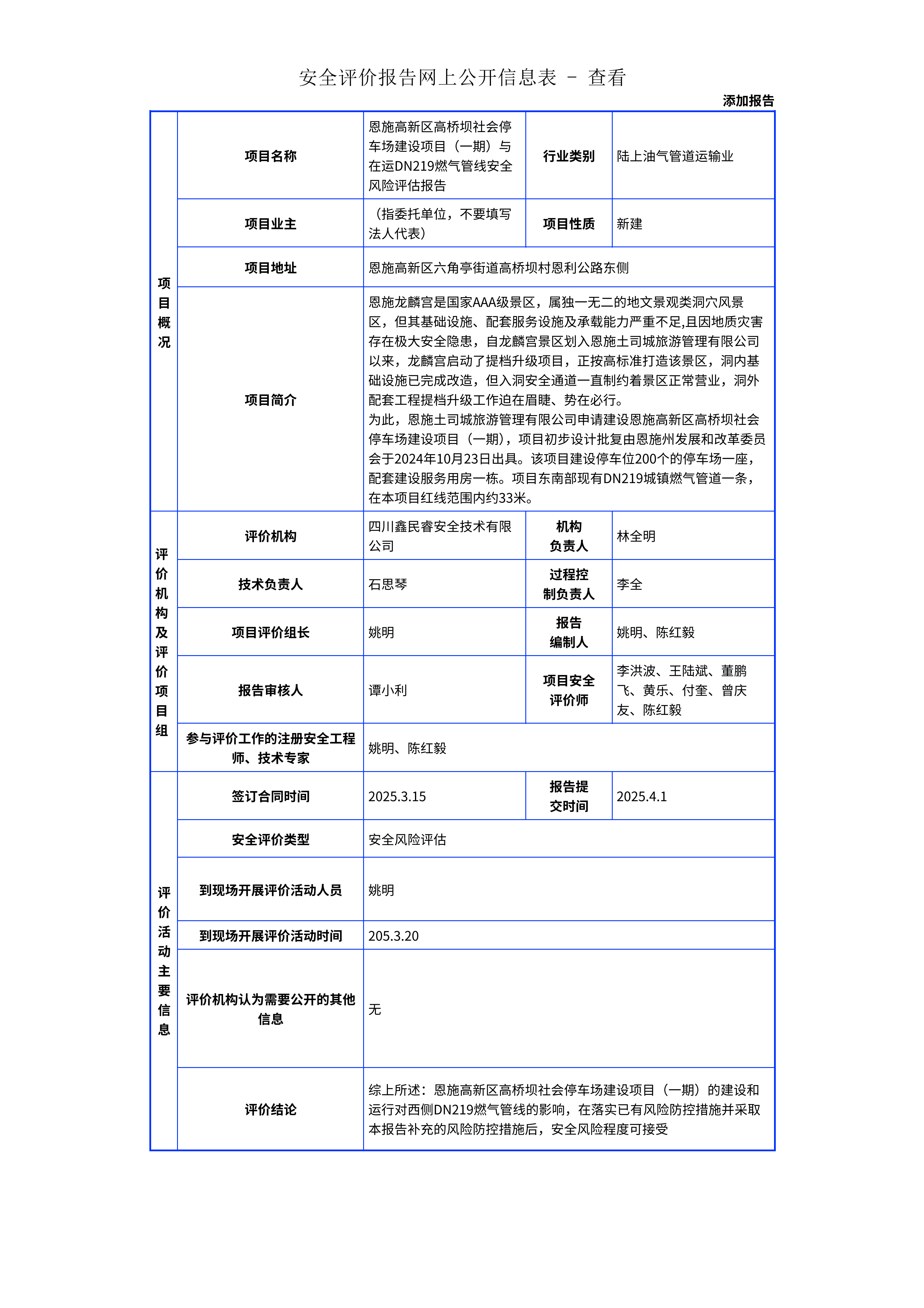 177恩施高新区高桥坝社会停车场建设项目(一期)与在运DN219燃气管线安全风险评估报告