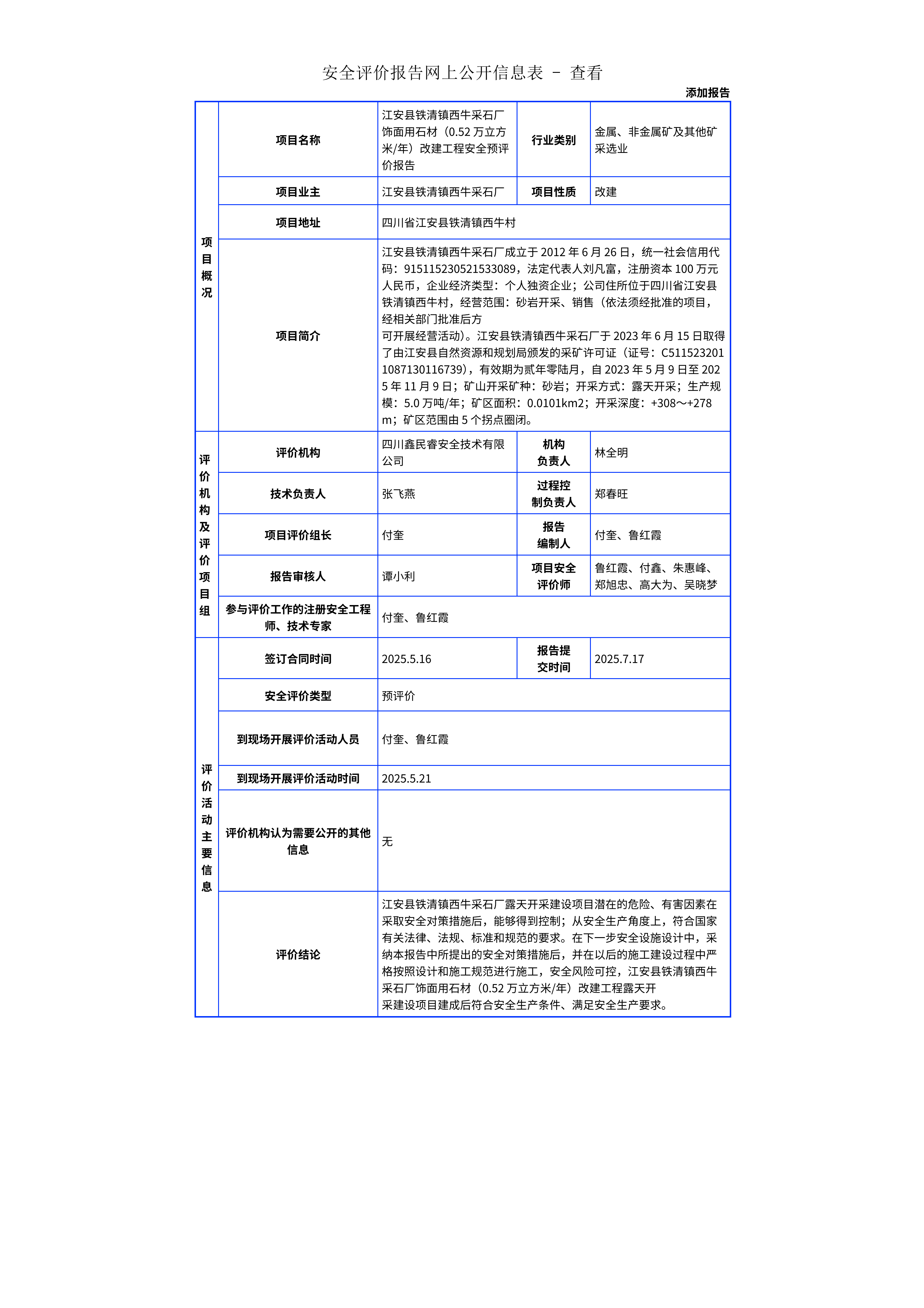 291江安县铁清镇西牛采石厂饰面用石材(0.52 万立方米年)改建工程安全预评价报告