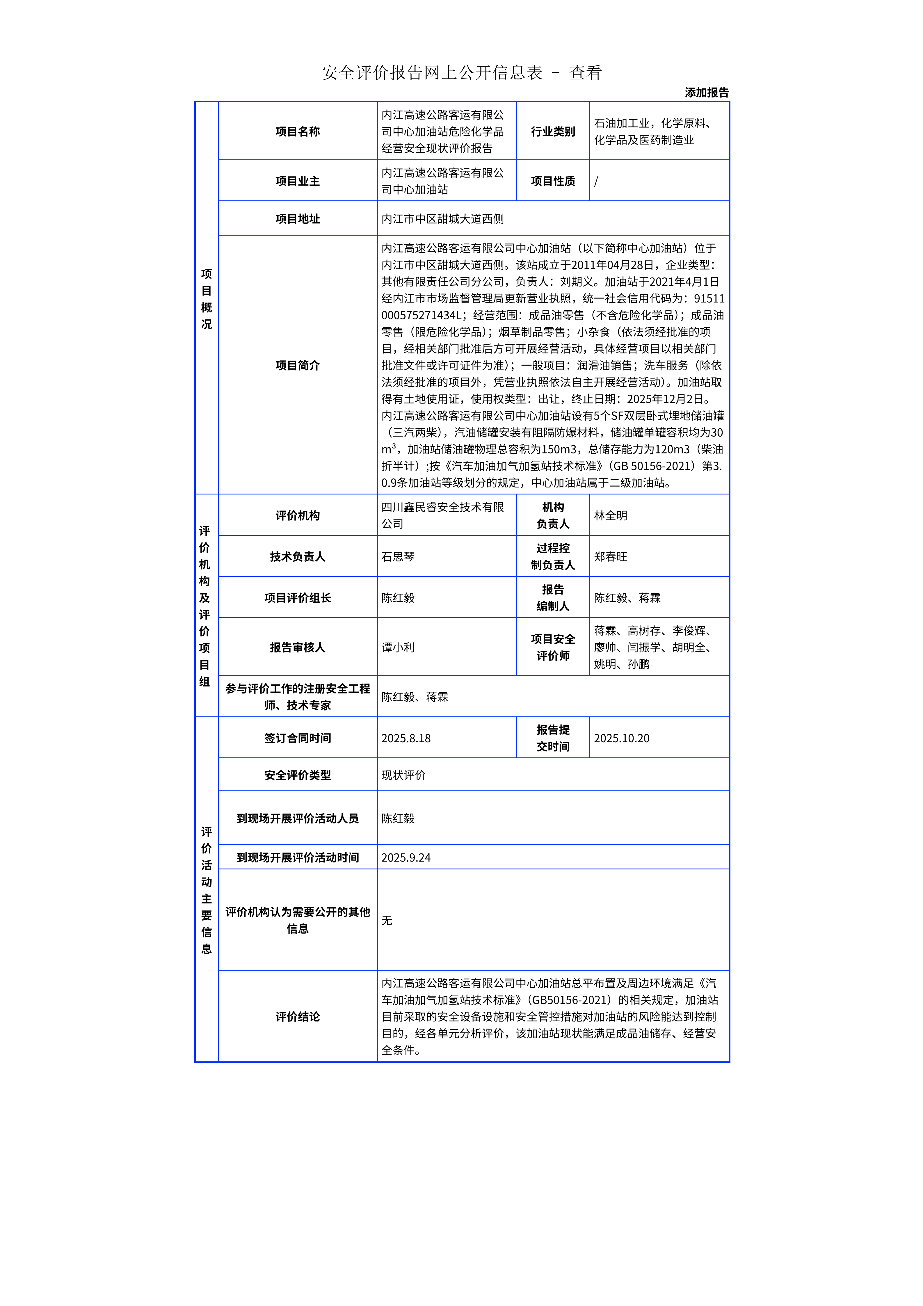 307内江高速公路客运有限公司中心加油站危险化学品经营安全现状评价报告