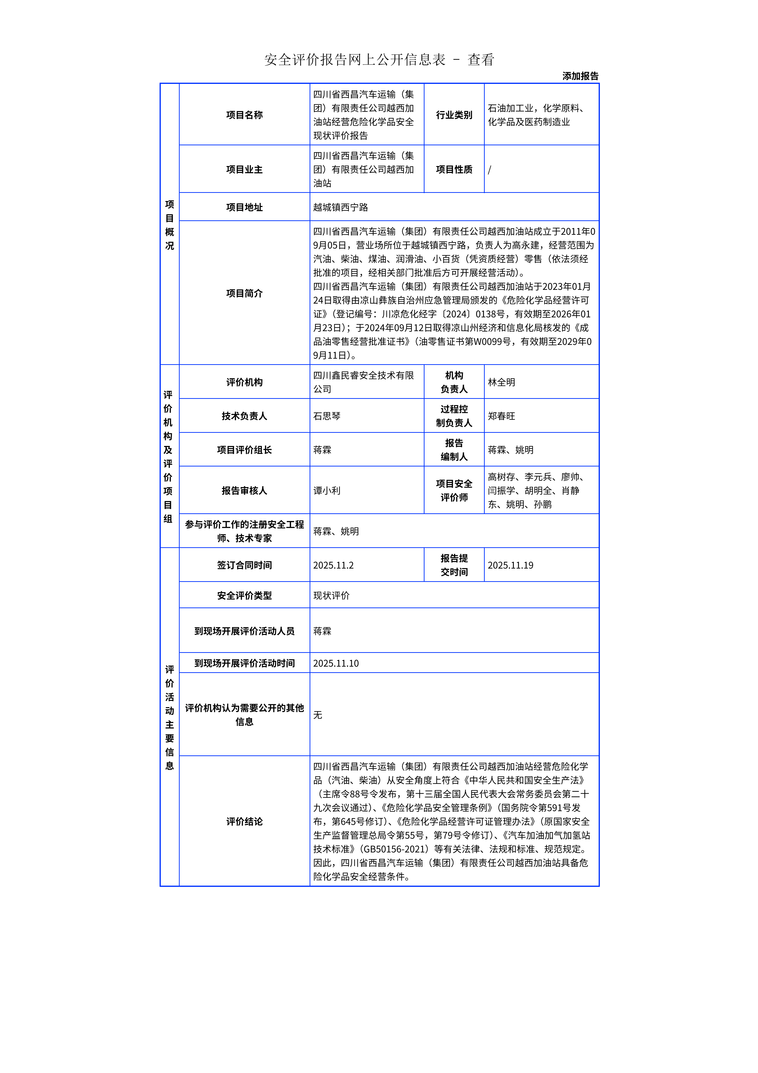 319四川省西昌汽车运输(集团)有限责任公司越西加油站经营危险化学品安全现状评价报告