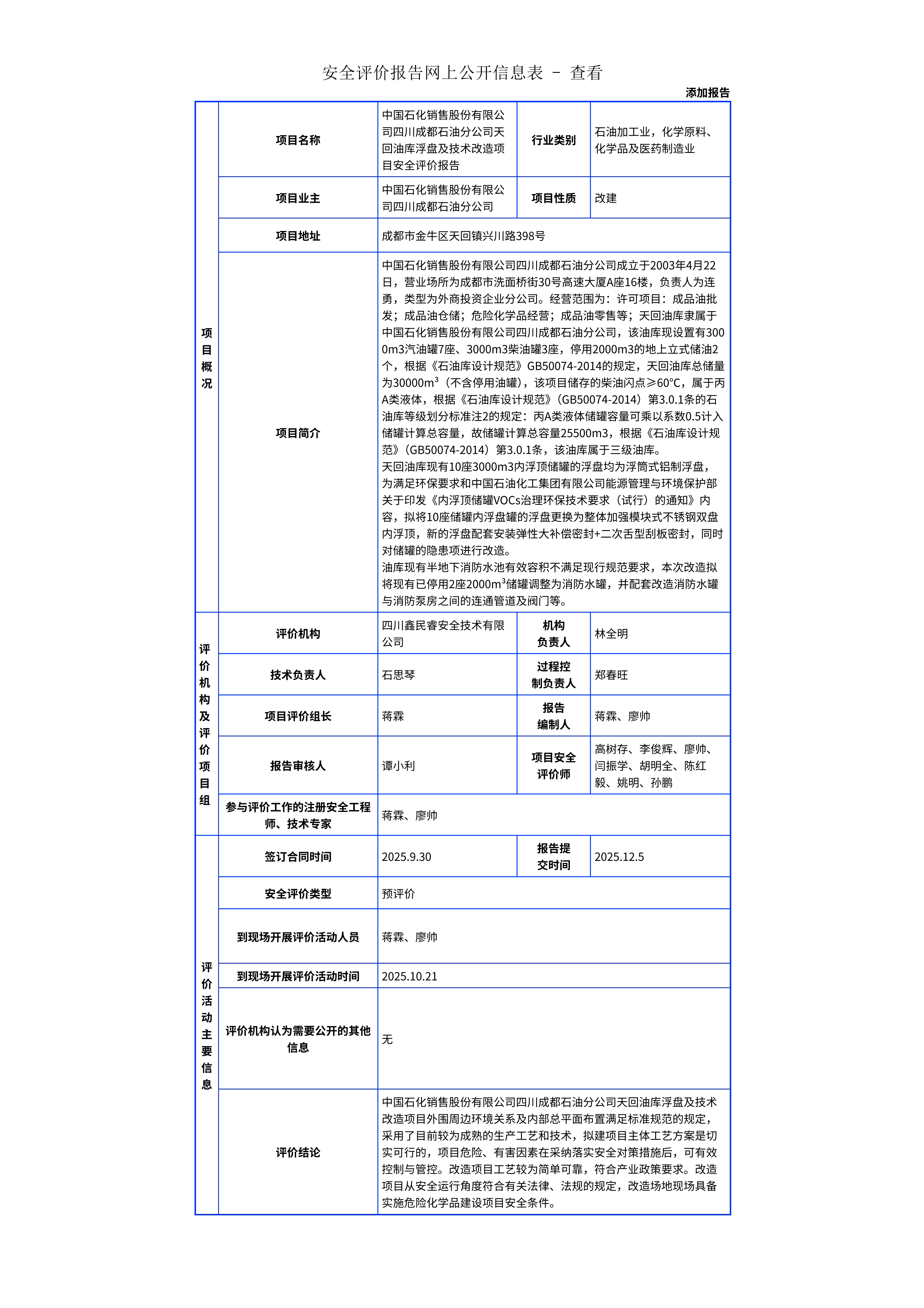324中国石化销售股份有限公司四川成都石油分公司天回油库浮盘及技术改造项目安全评价报告
