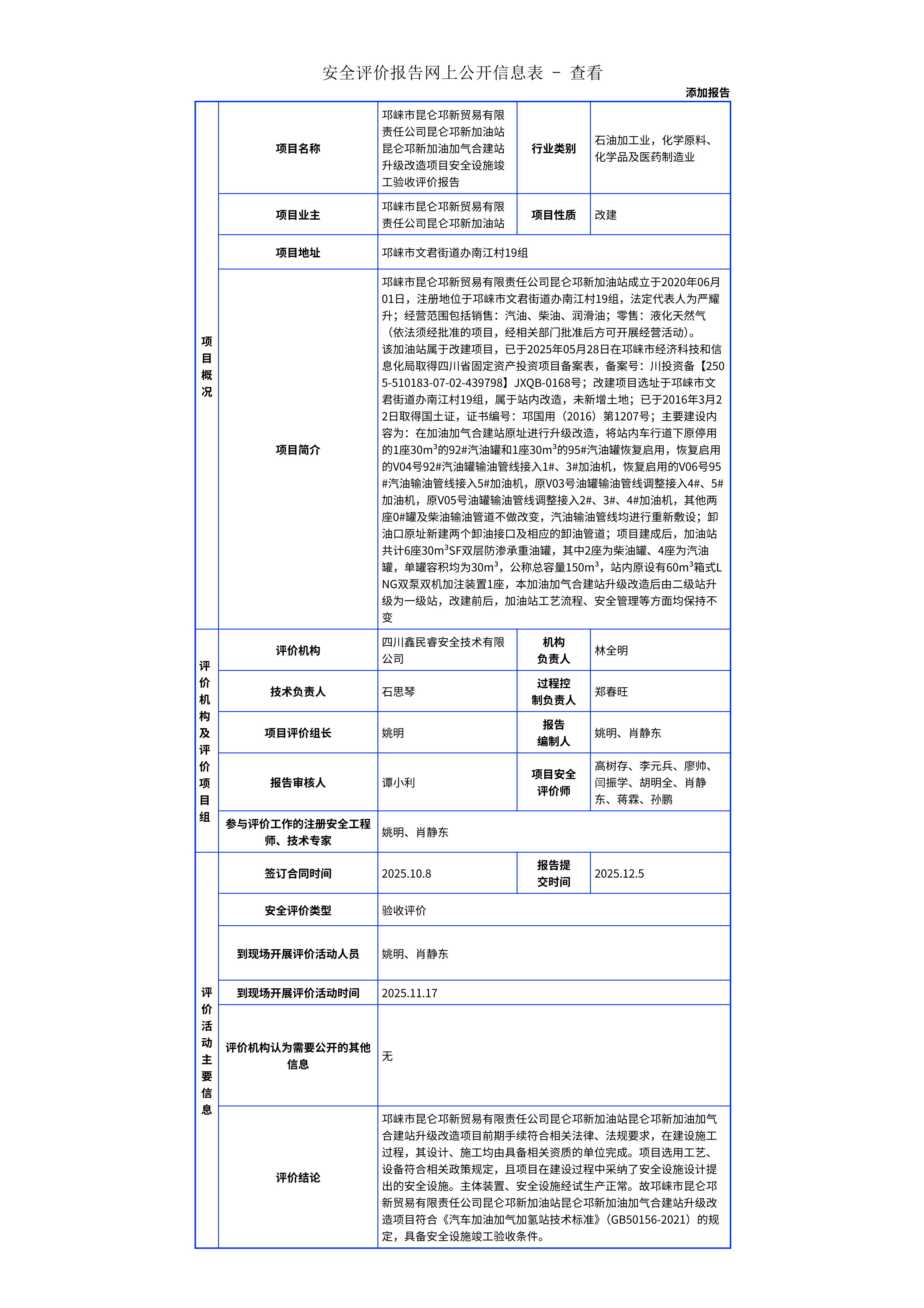 327邛崃市昆仑邛新贸易有限责任公司昆仑邛新加油站昆仑邛新加油加气合建站升级改造项目安全设施竣工验收评价报告