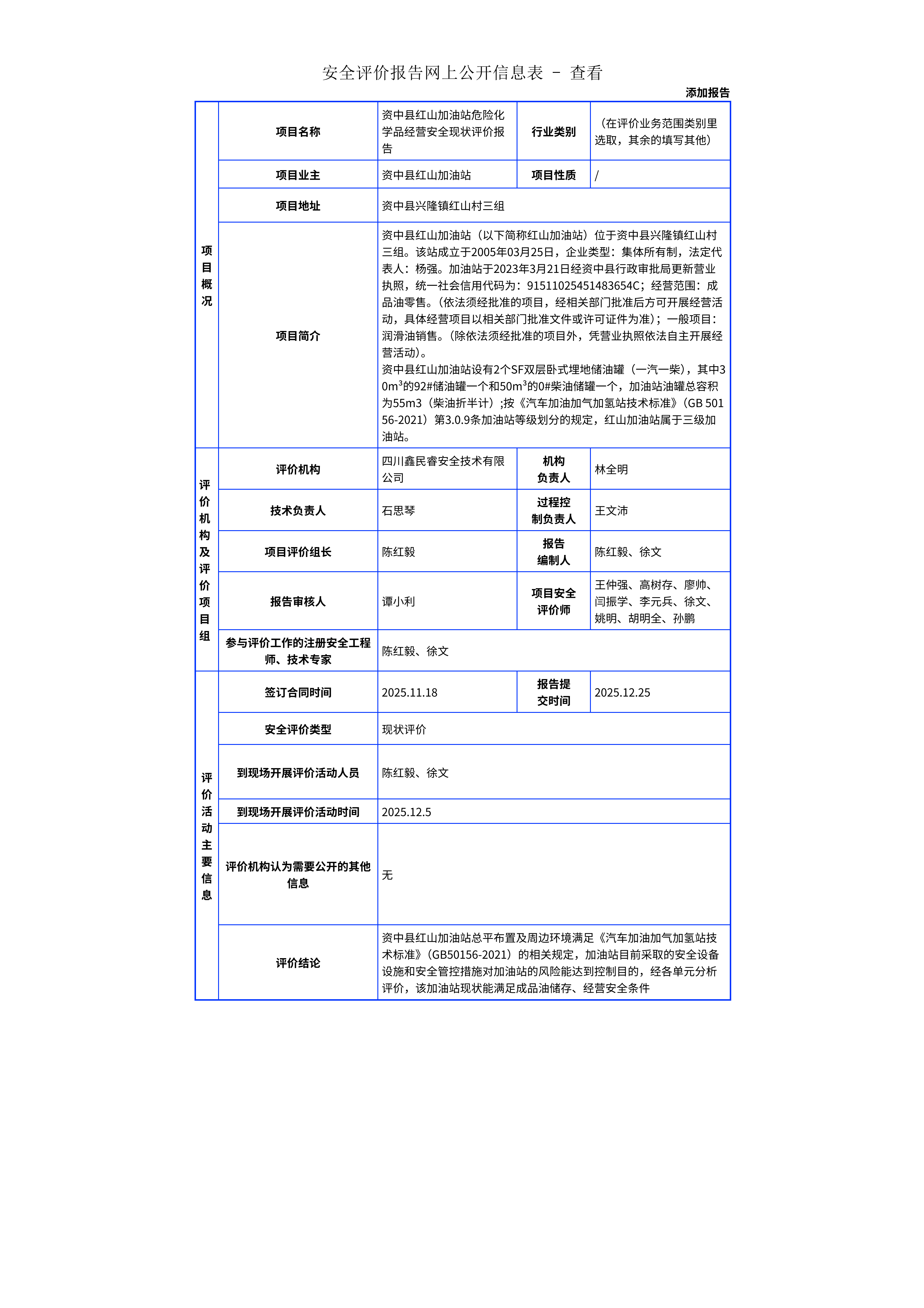 335资中县红山加油站危险化学品经营安全现状评价报告
