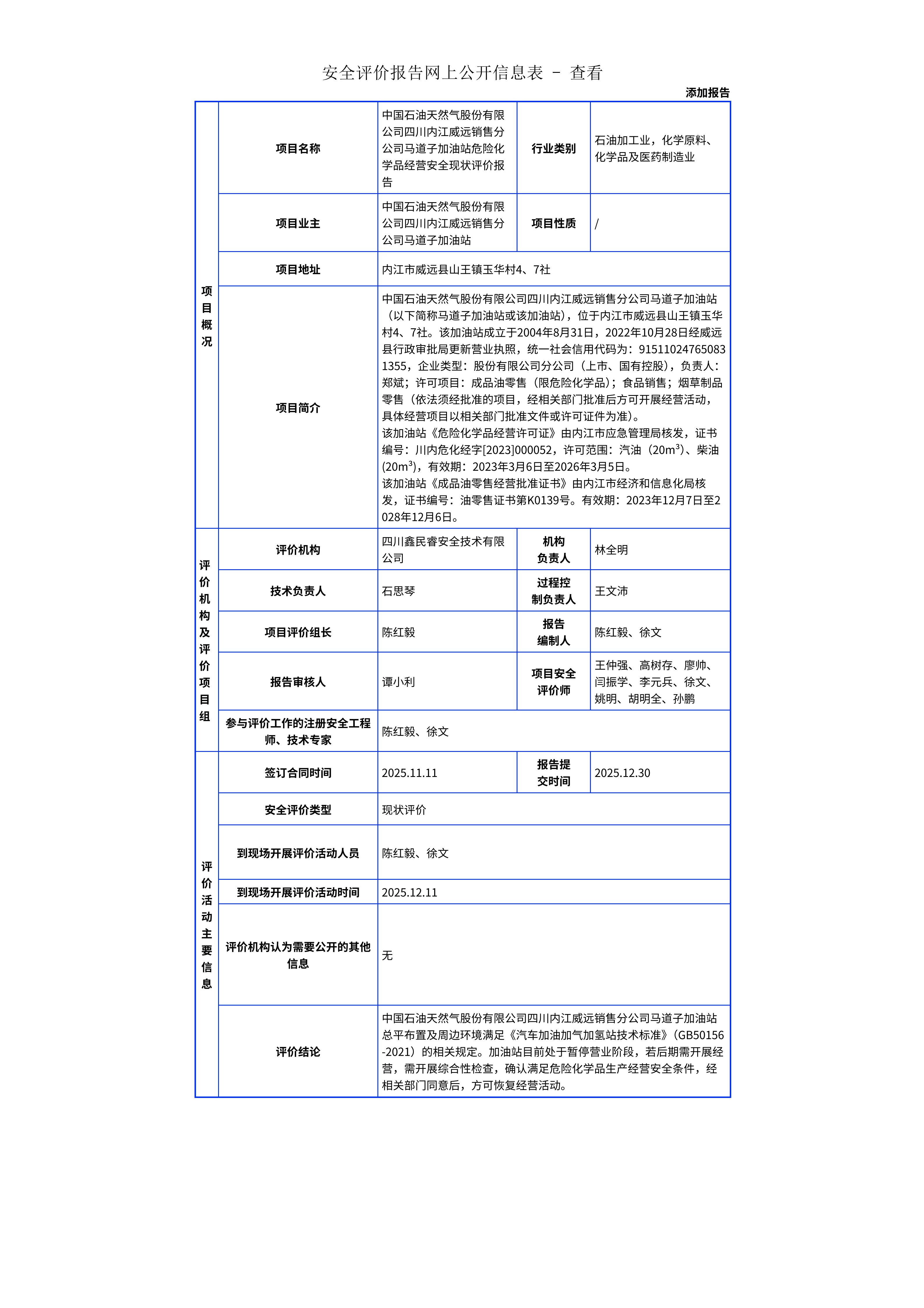 337中国石油天然气股份有限公司四川内江威远销售分公司马道子加油站危险化学品经营安全现状评价报告