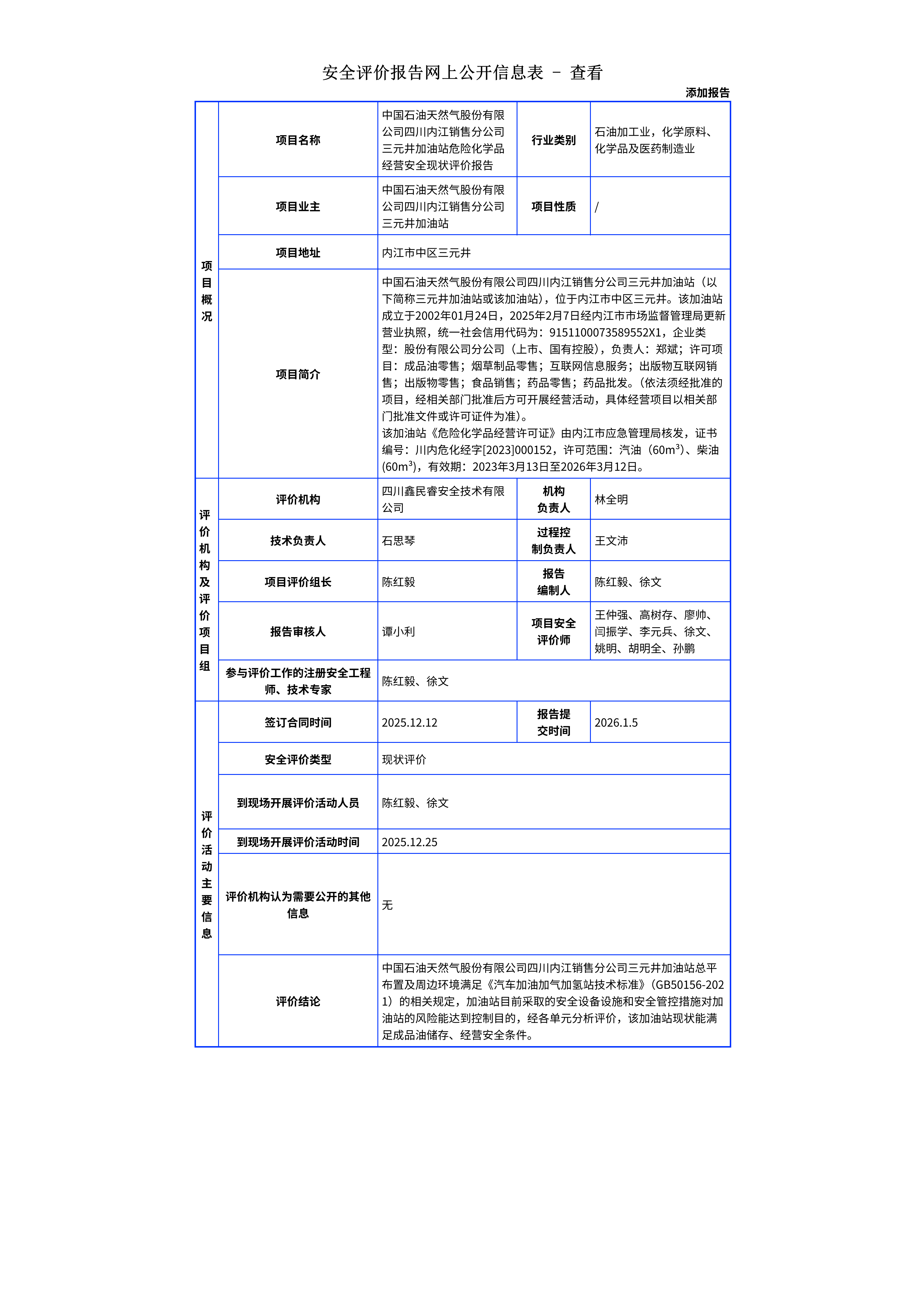 342中国石油天然气股份有限公司四川内江销售分公司三元井加油站危险化学品经营安全现状评价报告
