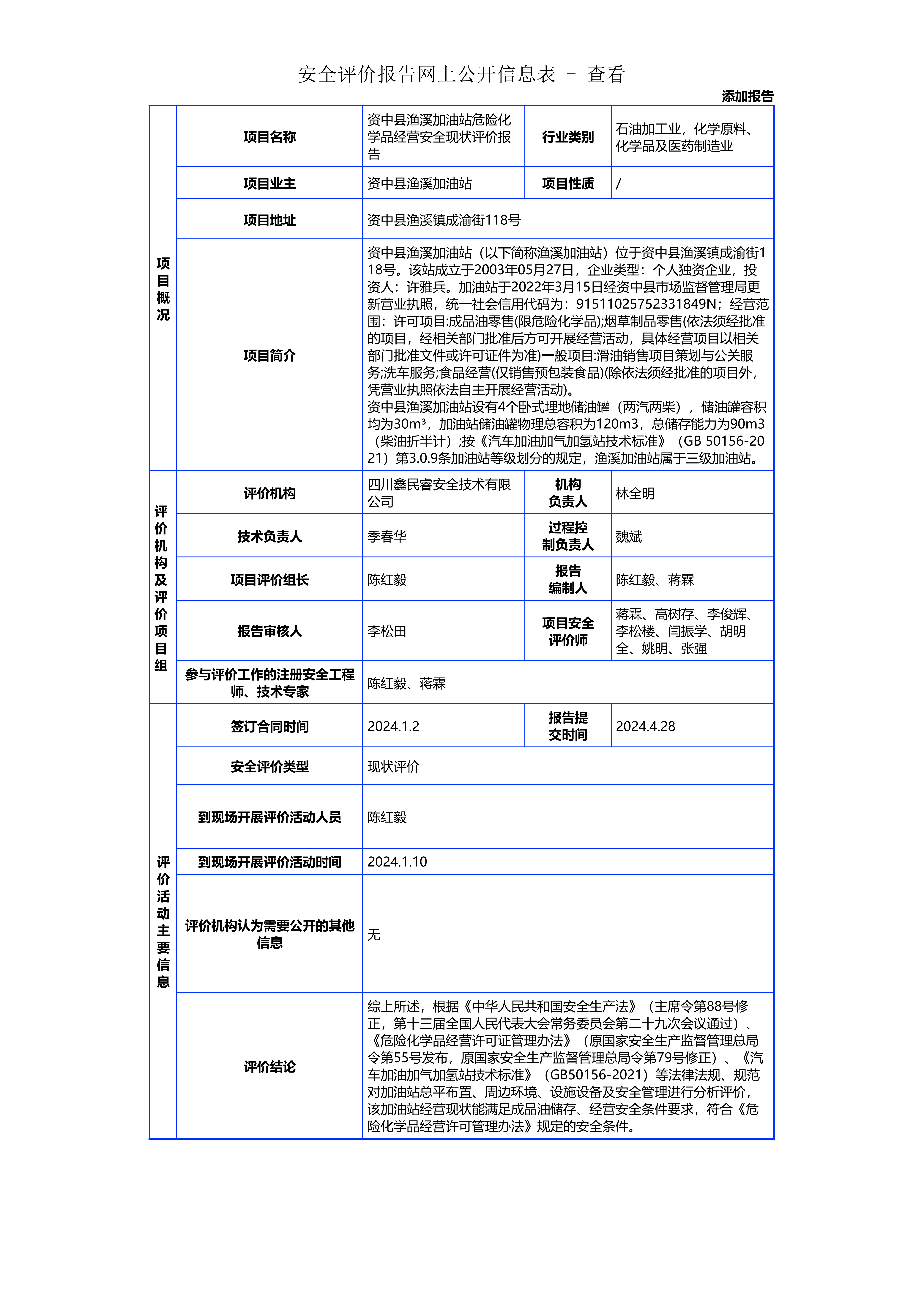 053资中县渔溪加油站危险化学品经营安全现状评价